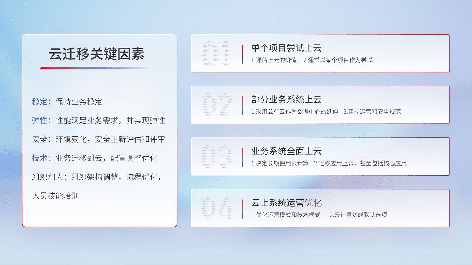 结合实际业务,,,,从规划设计、、、、云平台选型、、、、云原生改造、、数据迁移、、集成交付,,,迁移全过程为客户识别最佳上云路径,,,,做好风险识别管理,,,设计网络架构、、、身份权限、、、、安全审计合规、、、、操作审计、、、、日志审计、、监控告警策略、、多站点容灾设计等,,,,对云上基础设施进行整体规划,,,,提升IT治理水平,,,,以满足弹性、、高可用、、、高性能的需求。。。