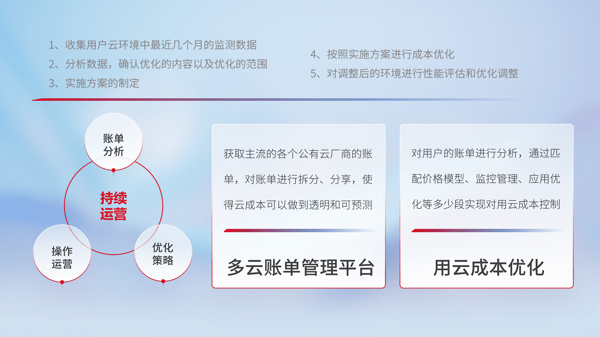 通过多云纳管,,,,以统一的资源数据模型把客户的云资源进行抽象和封装,,进而实现对多云资源的统一操作,,,保障云资源管理的可靠性、、、、稳定性与可用性。。量身定制化运维内容,,,,配置、、、开发运维、、、补丁管理、、、、备份、、、监控、、认证和访问管理、、、、审计和日常巡检等,,,,保障在用云过程中的可靠度,,稳定度以及高可用率。。。